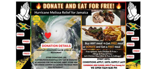Because of the overwhelming support from our community and the ongoing need in Jamaica, Caribbean Jerk Cuisine is EXTENDING our “Donate & Eat for Free” relief special — until supplies last!
